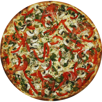 Соус, сыр Моцарелла, куриное филе, помидоры, огурчики, перец, репчатый лук, зелень, чеснок, грибы
